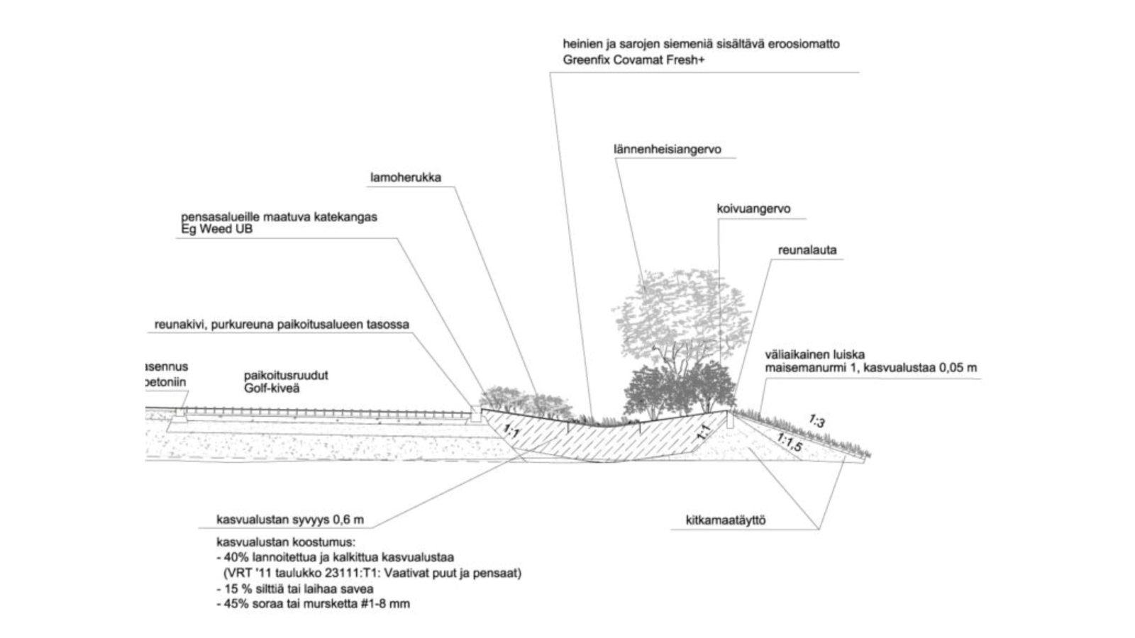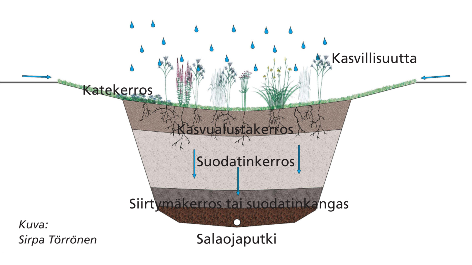 Suodattavat rakenteet toimivat sekä kasvillisuuden että rakennekerrosten avulla hulevesiä puhdistavina rakenteina. Rakenne vaihtelee ympäröivän maaperän ja ympäristöolosuhteiden mukaan.