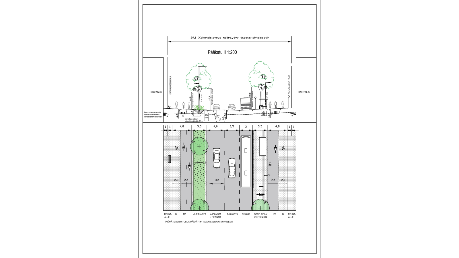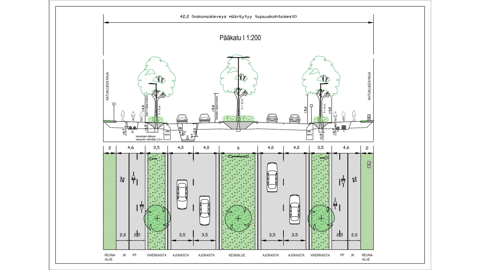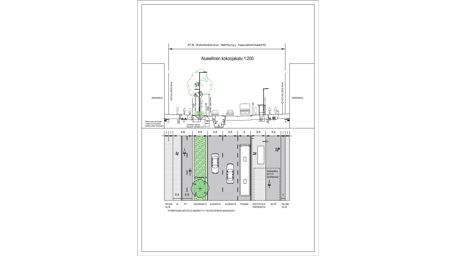 Kaistoja on yksi suuntaansa. Liittymissä varaudutaan lisäksi kääntyvien kaistoihin. Pyörätie toteutetaan molemmin puolin katua. Tarvittaessa jalankulku ja pyöräily erotellaan toisistaan kiviraidalla.