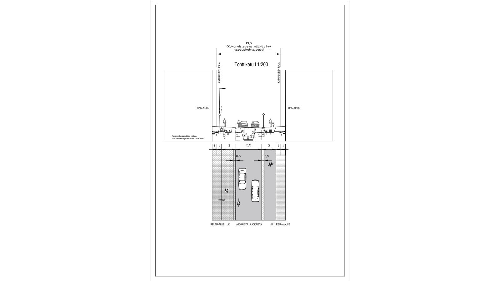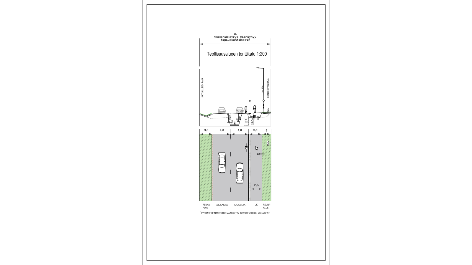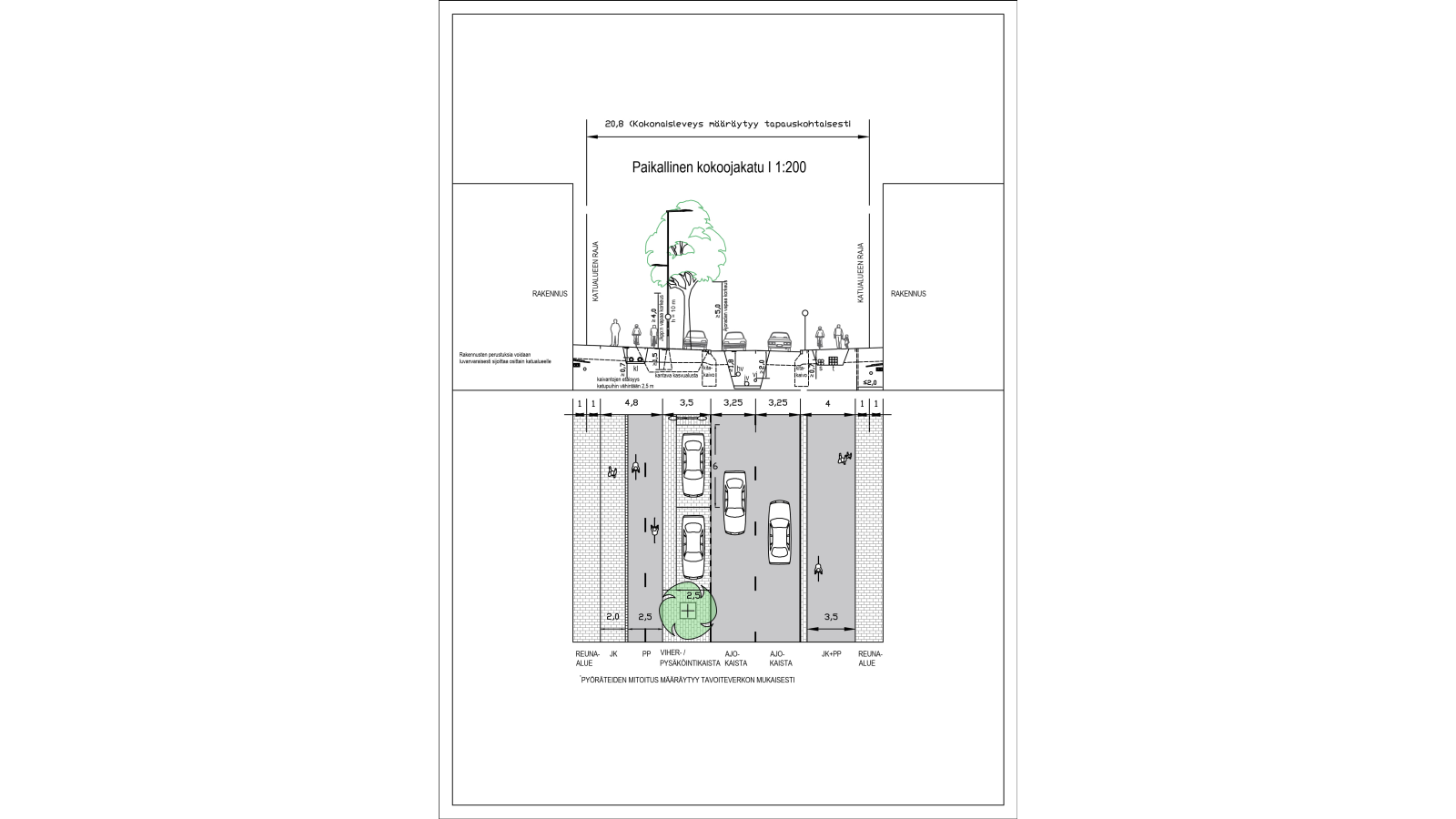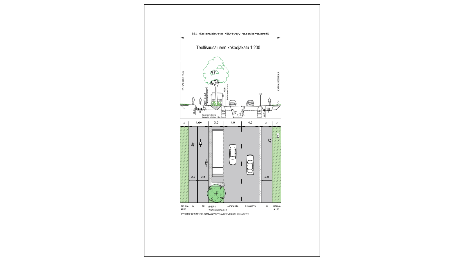 Kaistoja on yksi suuntaansa. Liittymissä varaudutaan lisäksi kääntyvien kaistoihin. Pyörätie toteutetaan molemmin puolin katua. Tarvittaessa jalankulku ja pyöräily erotellaan toisistaan kiviraidalla.