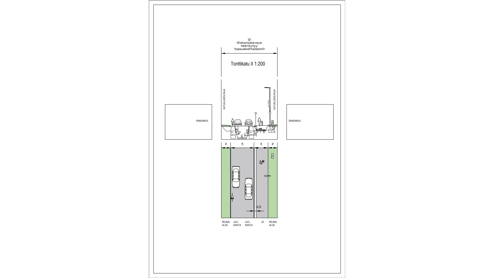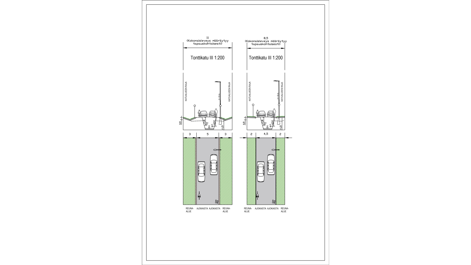 Kaistoja on yksi suuntaansa. Pyörätie ja jalkakäytävä toteutetaan vähintään toiselle puolelle katua ja tarvittaessa jalankulku ja pyöräily erotellaan toisistaan kiviraidalla. Toisella puolella katua voi riittää pelkkä jalkakäytävä.